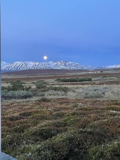 Von der Terrasse hat man einen beeindruckenden Blick auf die isländische Naturlanfdschaft