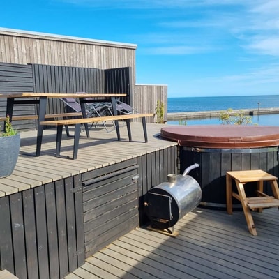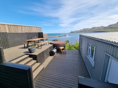 Diese Maisonette-Wohnung verfügt über eine große Terrasse, einen Whirlpool und einen Außenkamin. Nicht zu vergessen ist der atemberaubende Blick auf den Fjord/die Bucht.