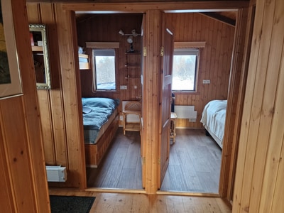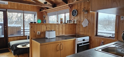 Everything is wood paneled: The well-equipped kitchen and the open dining area